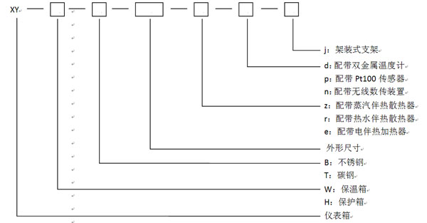 ② 配给1支连接挠性管接头,方便挠性管连接及密封(防爆工况严禁使用)。 ③ 依据用户提供的位号参数配给1支150×50×1mm不锈钢位号牌。 规格型号及定义